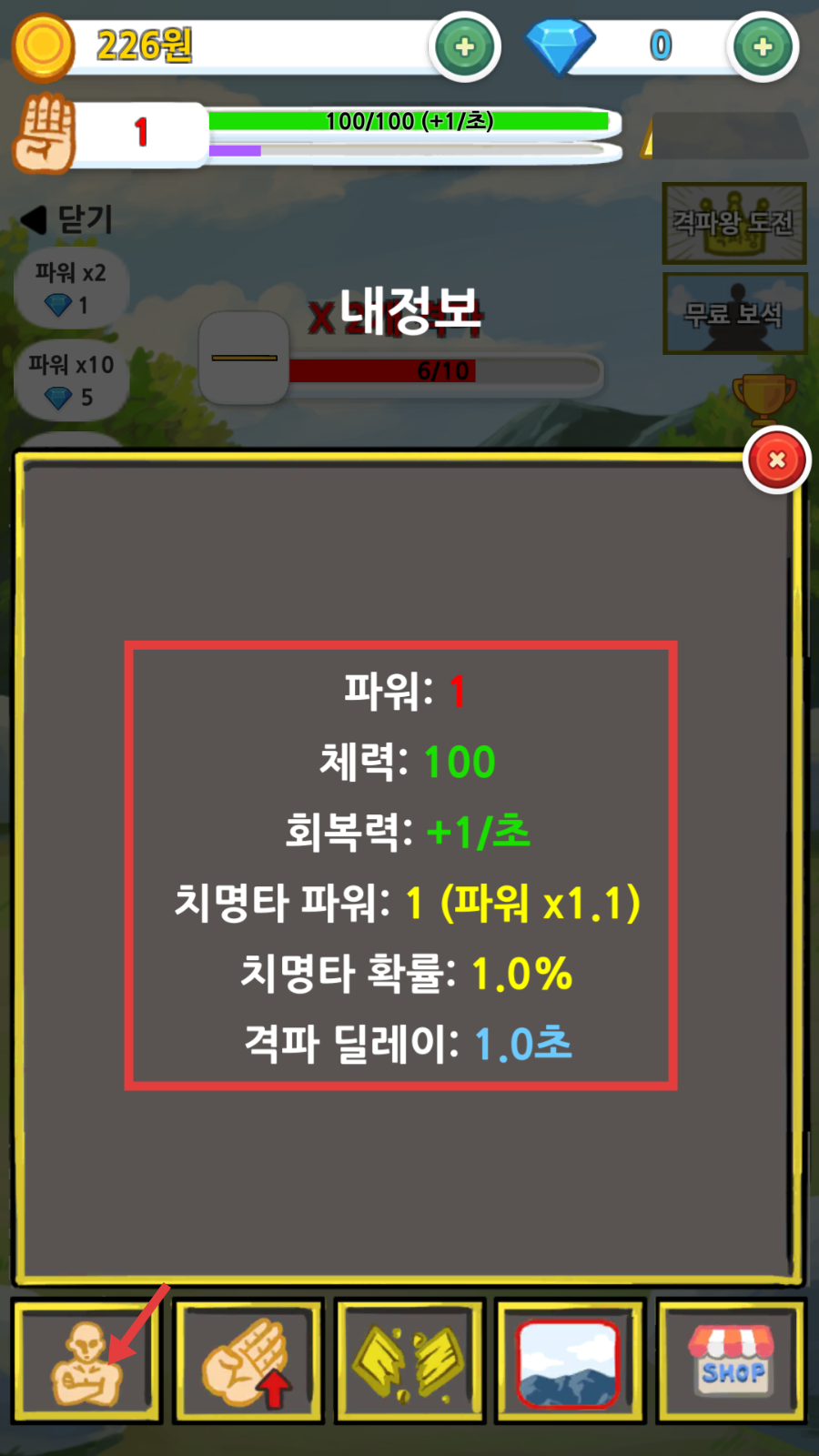 4、点击左下角按钮,查看【内信息】面板,掌握【力量-1】【体力-100】等属性,规划养成方向。
