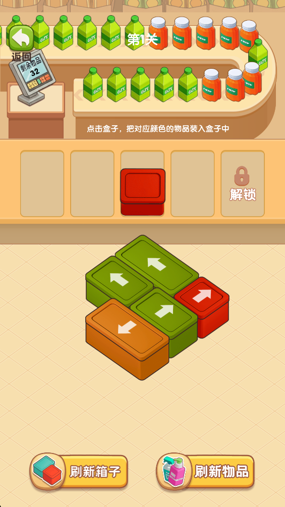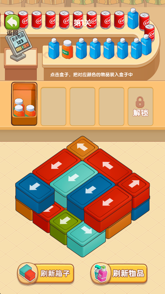 2.按照上方的饮料颜色选择下方的盒子,把对应颜色的物品装入盒子中。