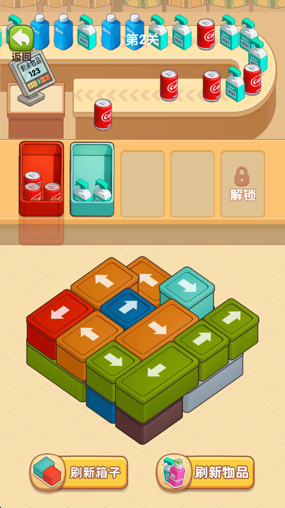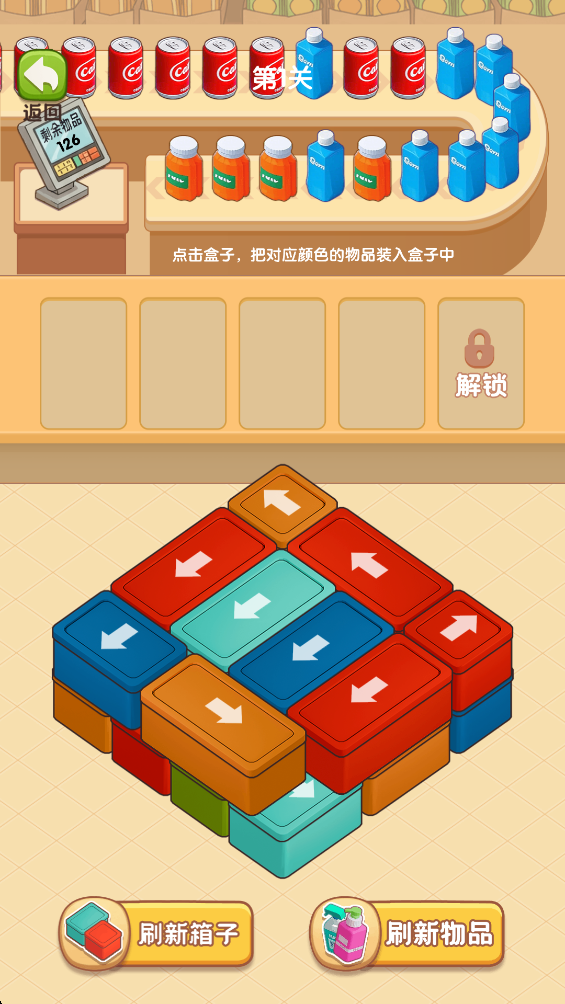 3.每个盒子都有一个箭头,盒子只能按照箭头行动,所以如果被堵住了的话要先想办法消除挡住的盒子。