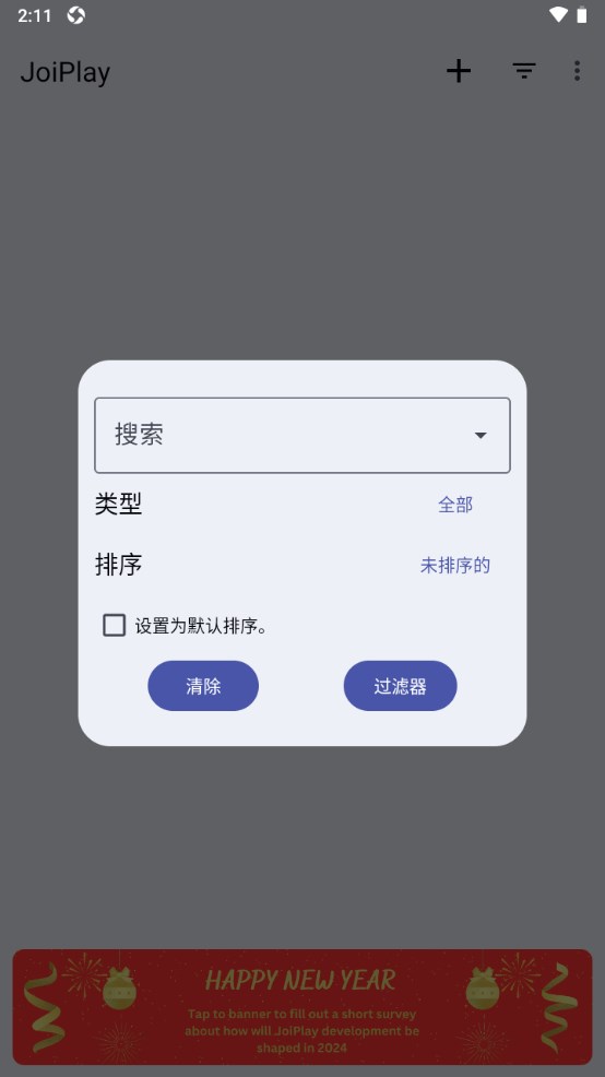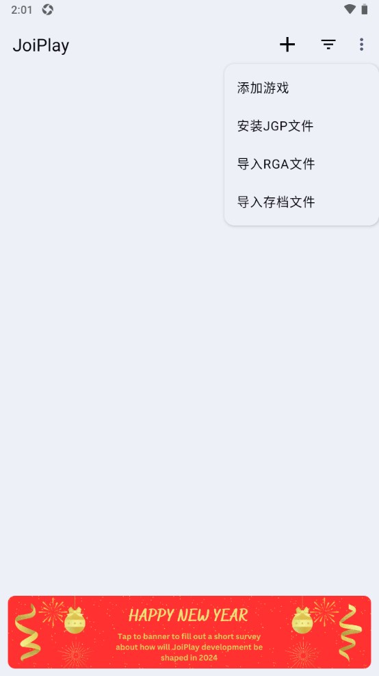 3.安装完成后,打开JoiPlay模拟器,并点击界面右上角的“+”按钮。