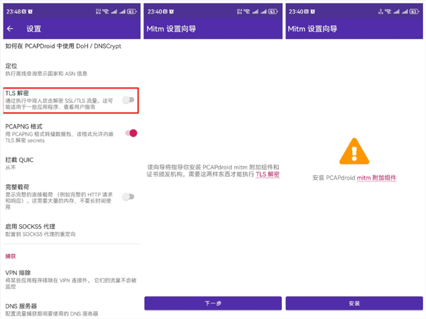 安装完毕后,使用PCAPdroid mitm打开PCAPdropid,在设置里便可成功勾选启用TLS解密功能: