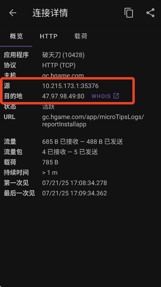 左图通过搜索框过滤特定目标主机,可以看到这些连接目前已经是关闭状态(CLOSED),因为用的是短连接场景;任意点选一个连接可以看到概览信息,包括连接持续时间,访问的URL、协议、进程APP和进程ID,以及产生的流量大小和载荷长度: