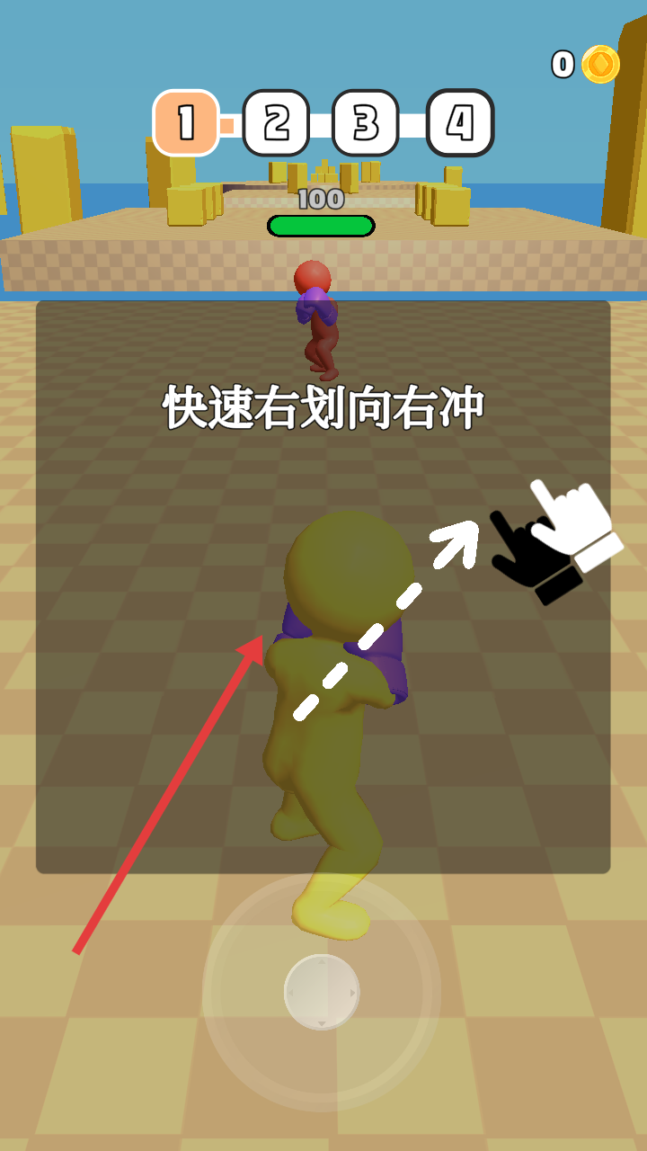 1、按提示快速右划,操控小人向右冲刺追击敌人,借助拳套发起攻击,同时留意对方反击时机。