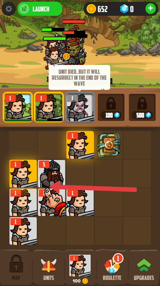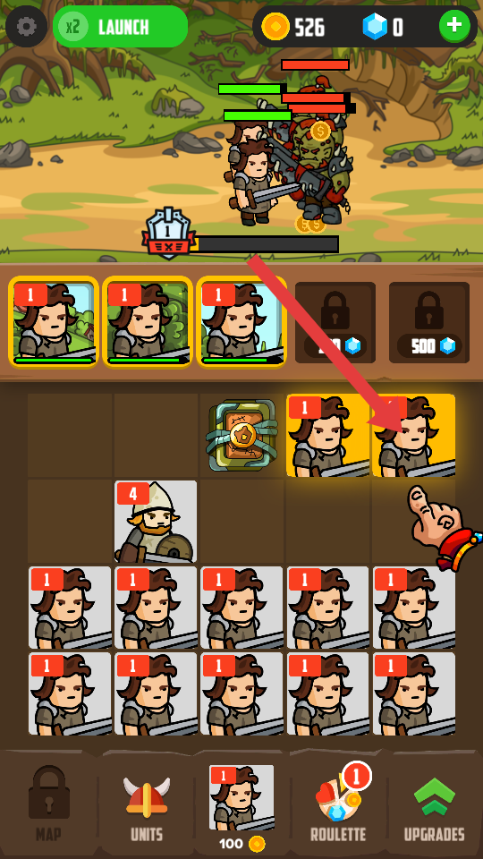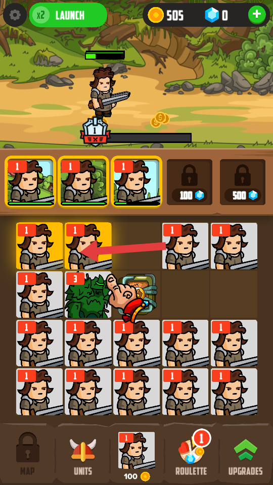 1、进入游戏的页面,需要拖动相同的等级勇士,如1级进行合并,升级为高等级单位3级、5级,强化战力。