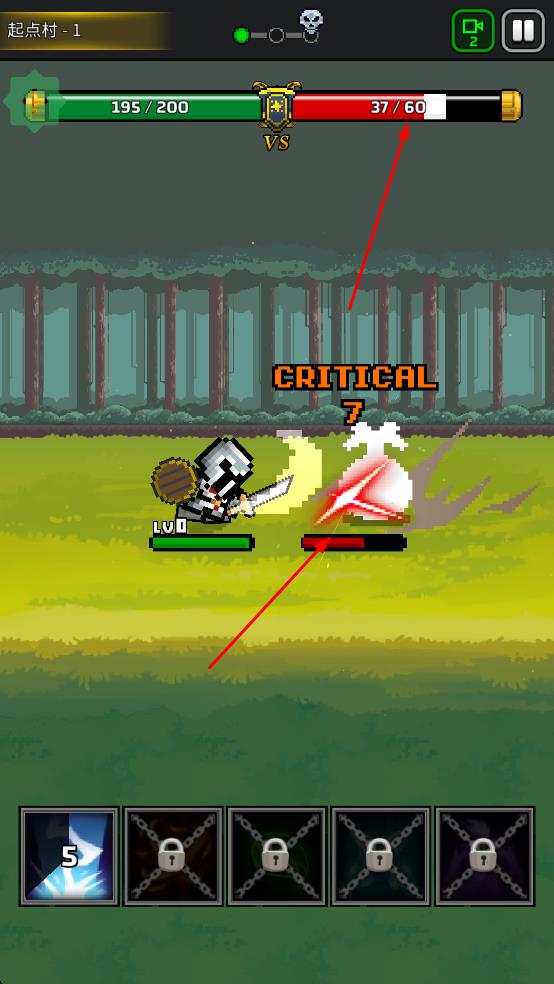 2、战斗中角色自动普攻,触发CRITICAL暴击,适时使用技能,关注双方血量条推进关卡。