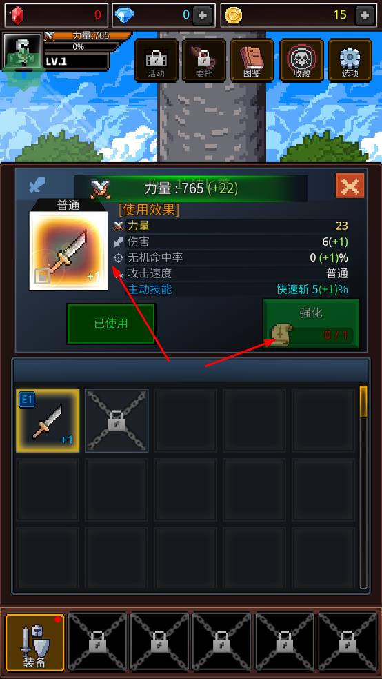 3、武器成长可视化:武器打造前后的变化清晰可见,从外观颜色、细节纹理到属性数值均有直观展示,比如基础铁剑升级为青铜剑后,剑身会呈现青铜光泽,攻击力数值同步提升。