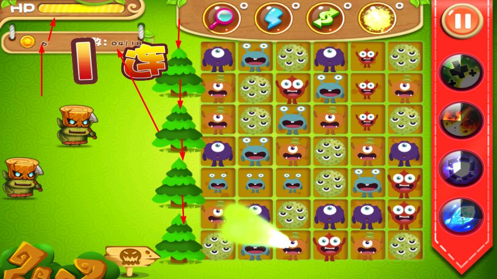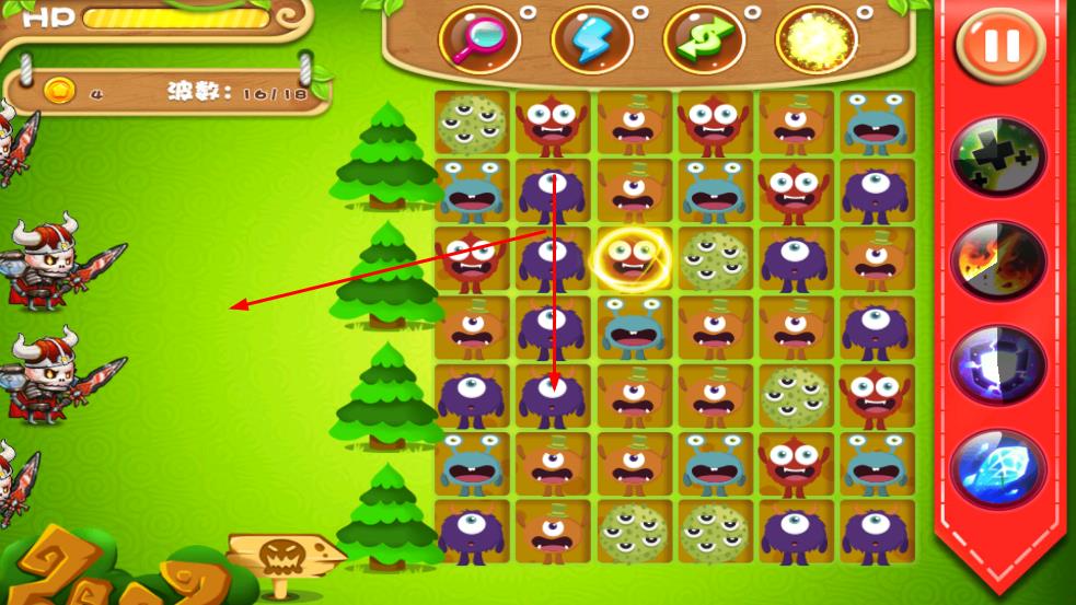 1、消除怪物应对左侧敌方单位,触发连击提升伤害,关注HP与波数进度,策略规划消除。