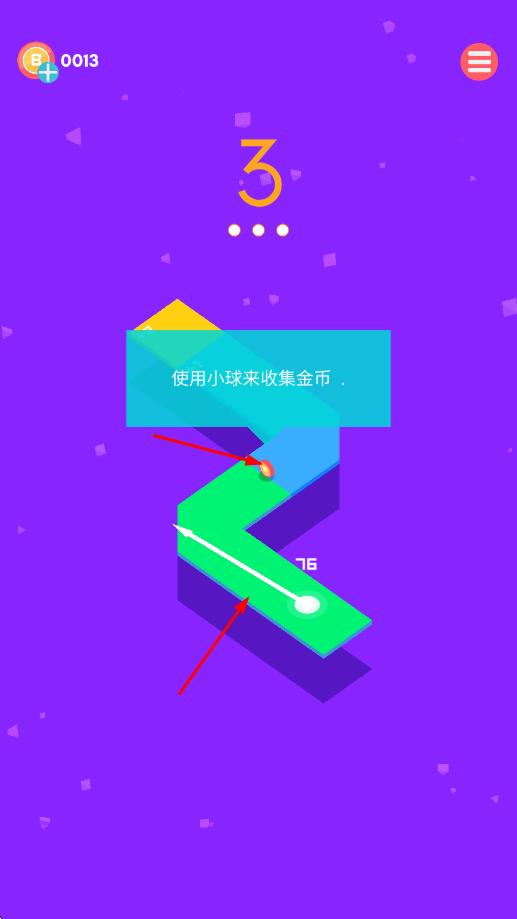 1、第3关依提示-操控小球沿绿蓝路径-朝着【红色金币】方向-按箭头指引移动收集。