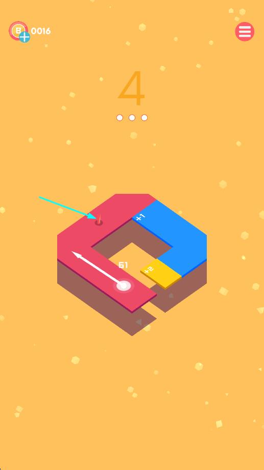 2、第3关引导小球-穿越蓝黄板块-借助轨迹惯性-让小球顺利抵达路径末端通关。