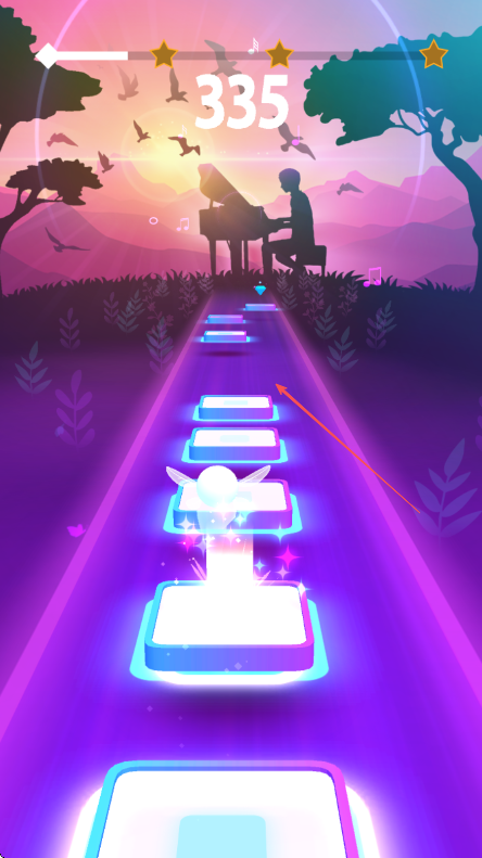 2、跟随音乐节奏,让小球准确落在前方踏板上,随着分数增加,如335,踏板间距和节奏会变化。