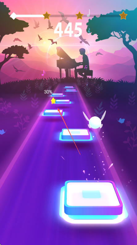 3、前进过程中,注意收集踏板间的星星等道具,获取更高分数,努力达到更高分数目标,如445。