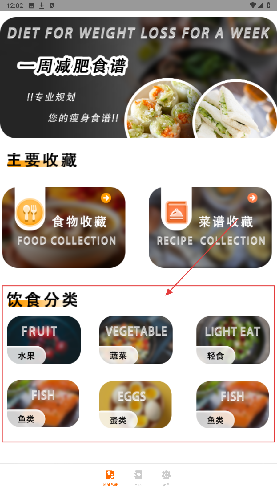 1、进入瘦身食谱页,在【饮食分类】选类别,如【水果】,查找对应食材。