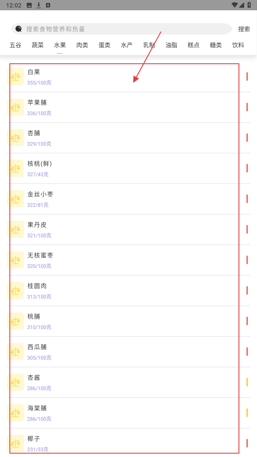 2、在【水果】分类列表,选具体食材,如【白果】,查看热量、营养信息。