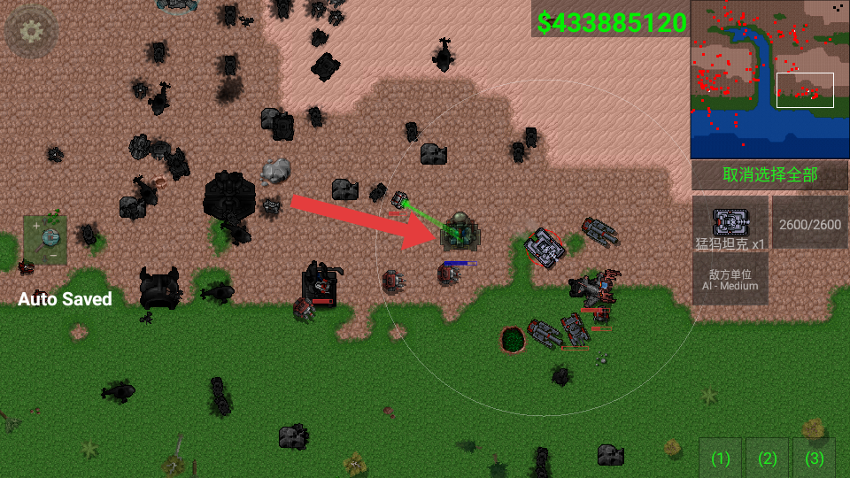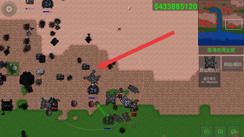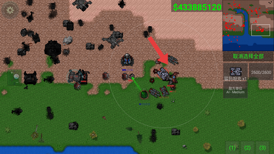 3、紧跟右上角小地图显示的敌方动向,遭遇标注AI-Medium的敌方单位时,集中已方兵力发起攻击,摧毁重型坦克等。