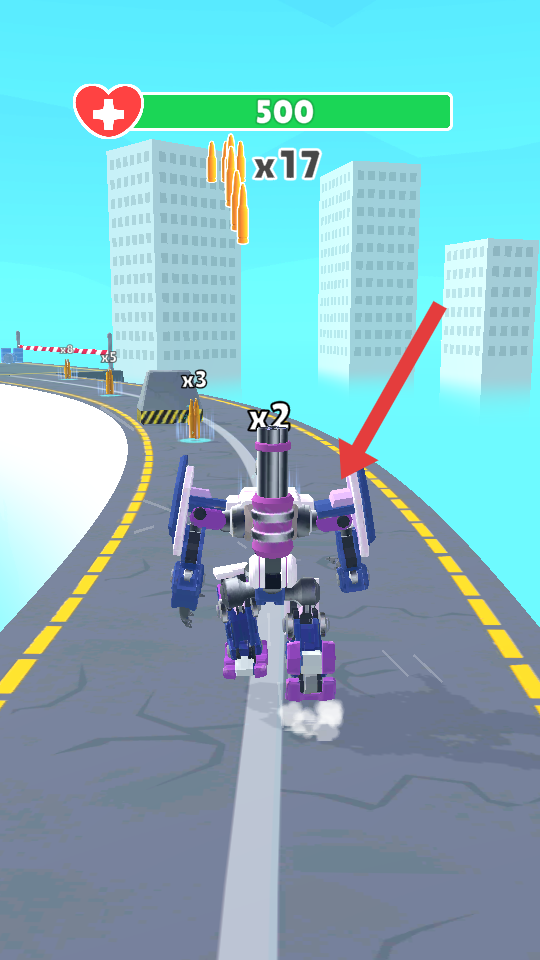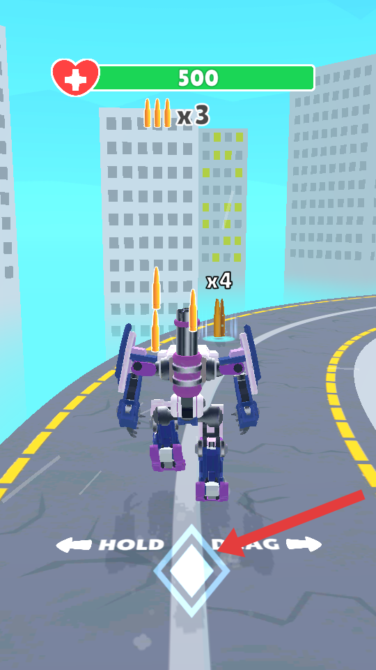 1、进入游戏,长按拖动HOLD DRAG区域,控制机器人左右移动,收集道路上的x3弹药,规避障碍前行。