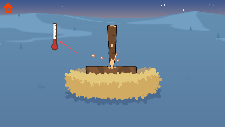 2、留意左侧温度计,点击速度恰当能使温度上升,冒出火星后,说明快要成功生火。