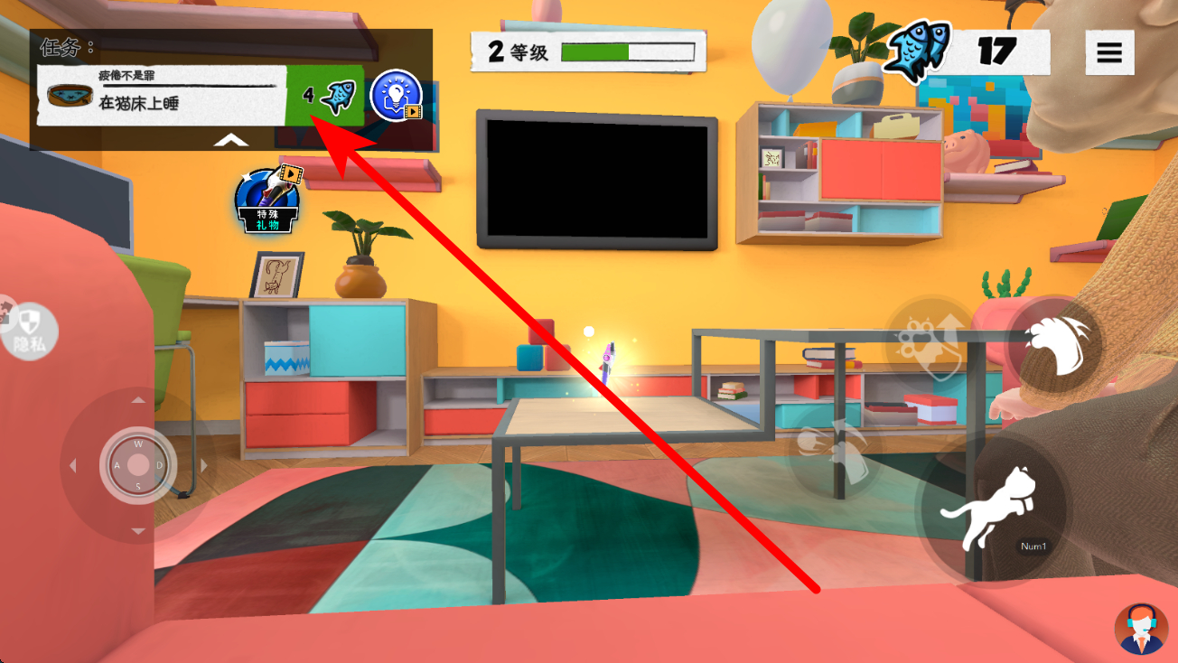 1、新手完成任务疲倦不是罪后,查看任务栏指引,操控宠物移动,依据箭头提示找猫床,靠近显示睡觉标识的猫床,准备互动。