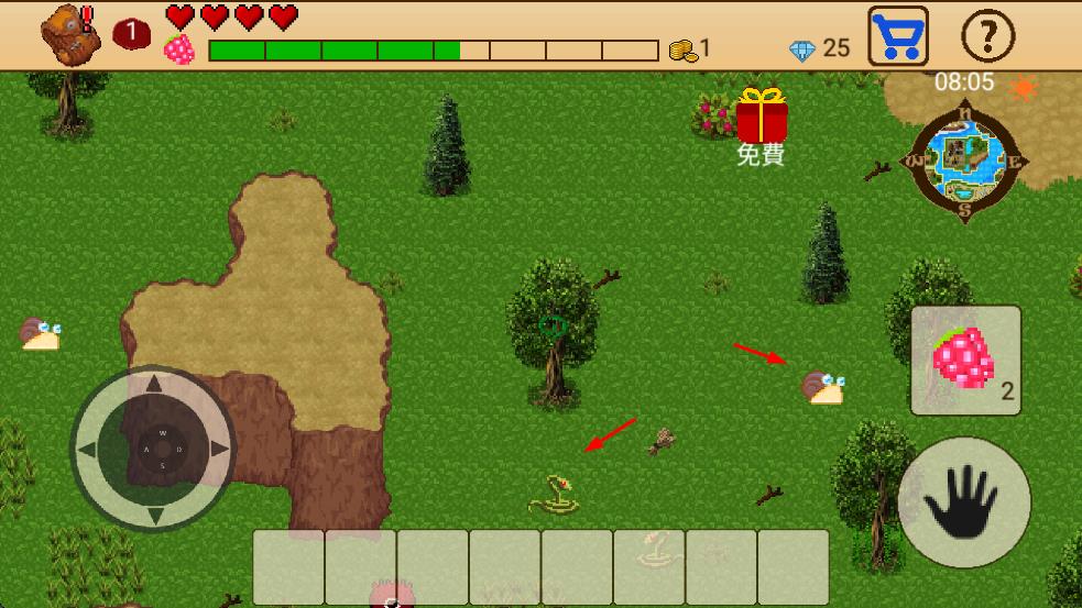 1、野外探索操控角色收集树莓、蜗牛,击败蛇类,积累基础资源。