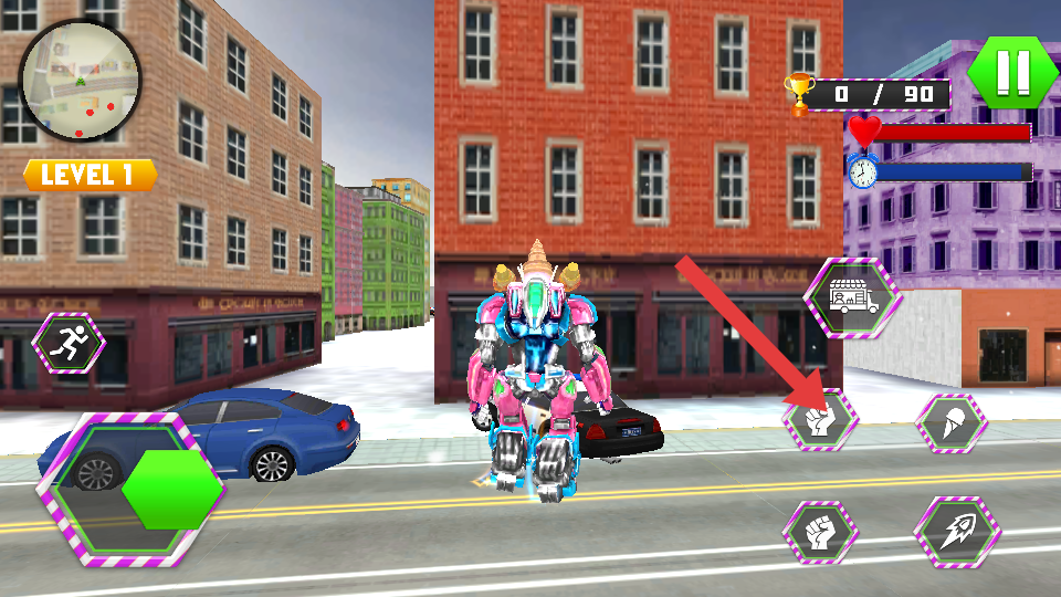 1、操控机器人在城市街道移动,点击右侧技能按钮如拳头、火箭图标,发起攻击的关键操作,点击可打击目标。