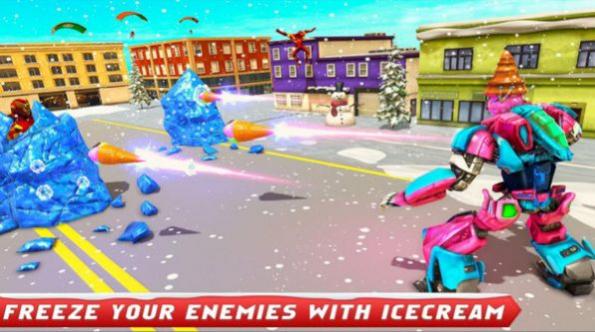 2、冰冻战斗策略运用:战斗时操控改造后的机器人,利用其冰淇淋赋予的冰冻能力,瞬间将敌人冰冻使其无法移动,借此控制战局,同时注意机器人血量有限。