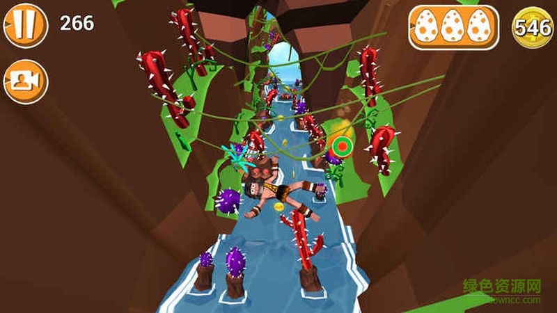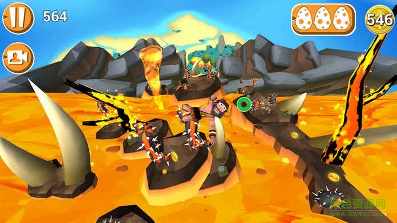 1、进入游戏后,通过滑动屏幕控制原始人移动方向,躲避路上的障碍物,像带刺植物等,同时收集金币,若不慎碰到障碍物,原始人会摔倒,影响行进。