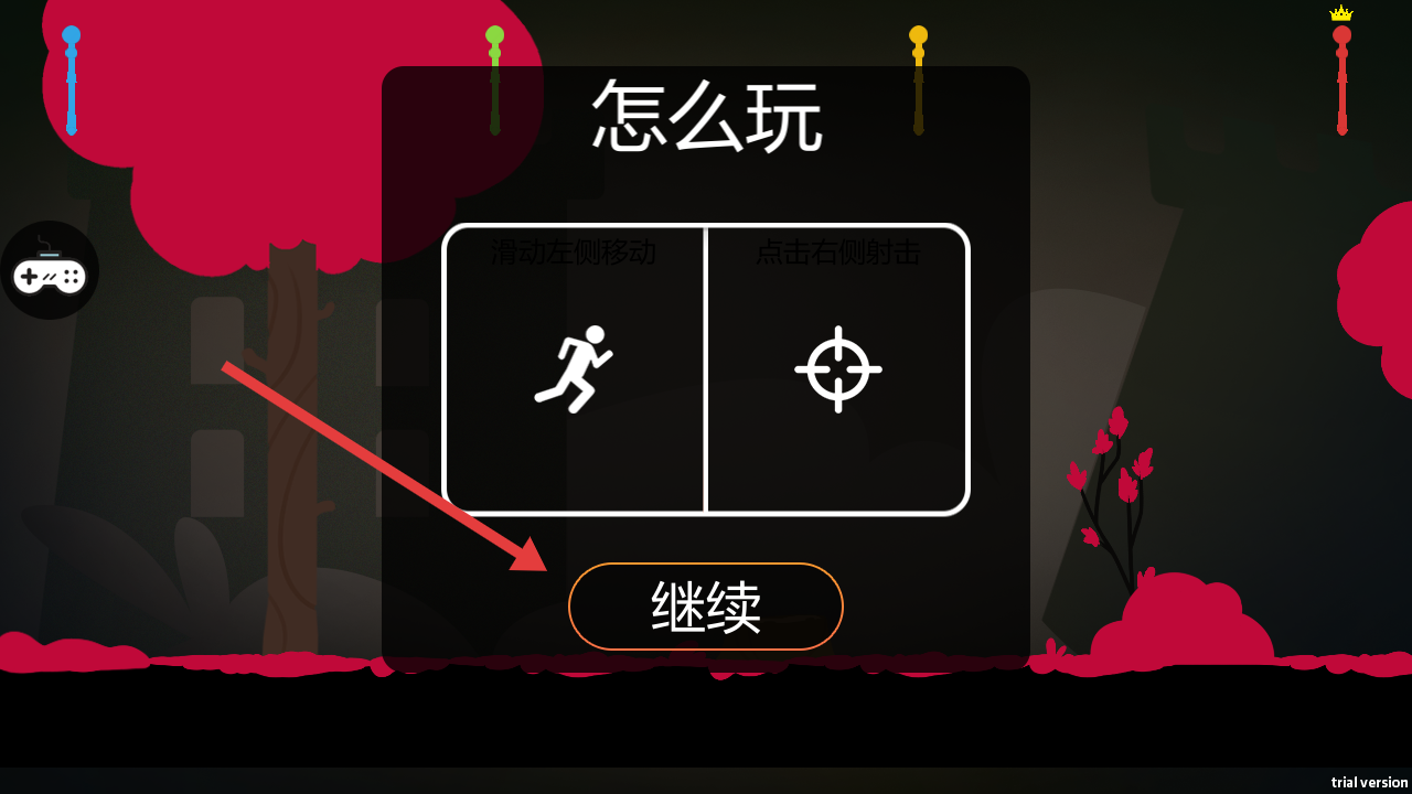 1、在怎么玩提示界面,点击继续,进入游戏,游戏操作方式为滑动左侧屏幕控制移动,点击右侧屏幕进行射击。