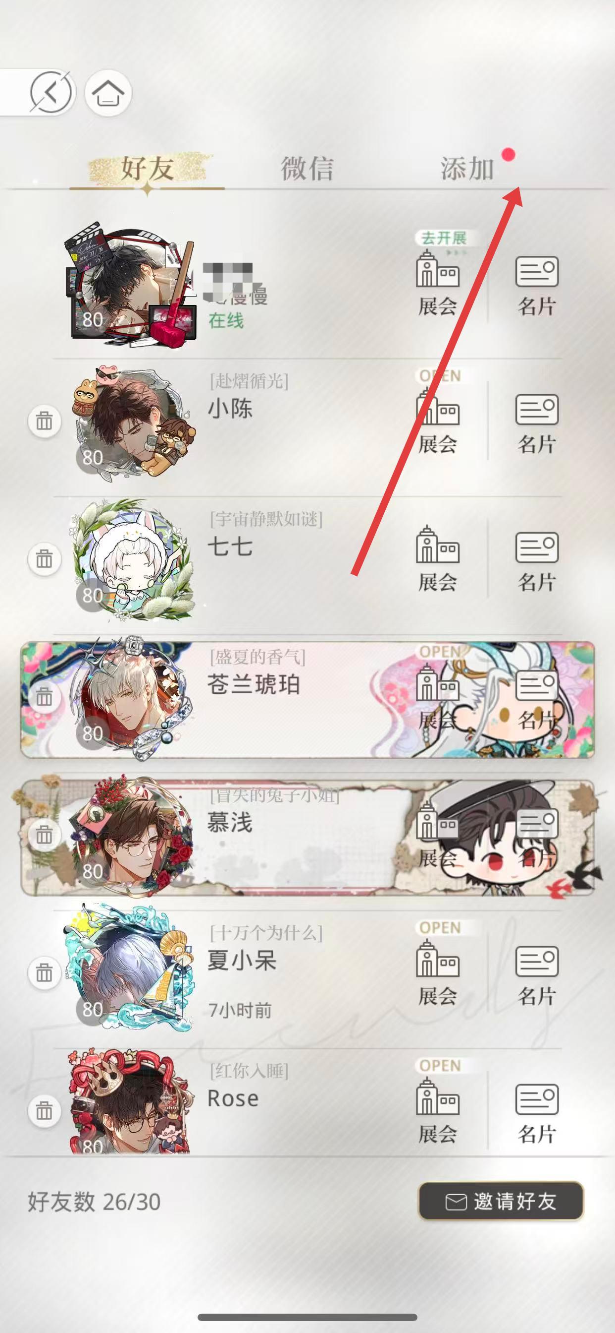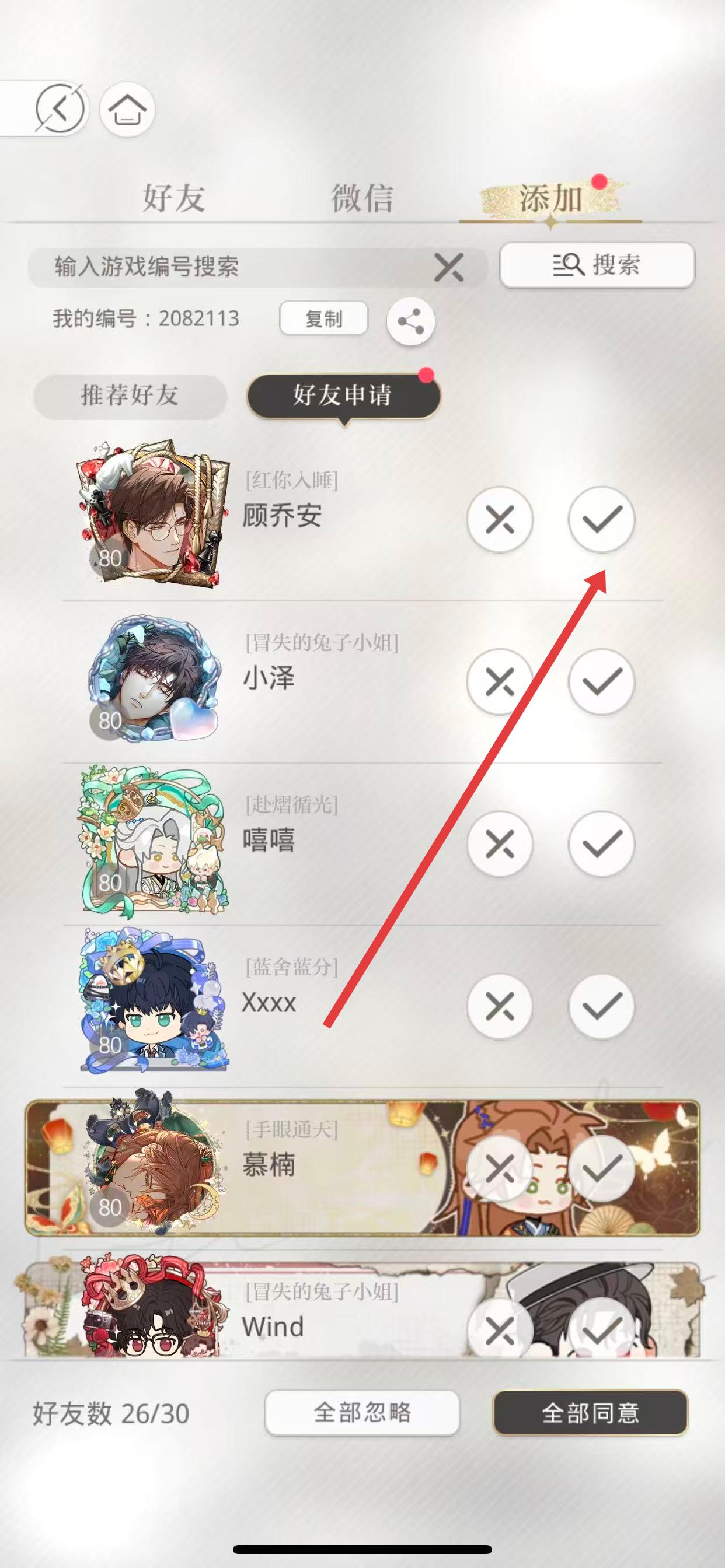 3、好友申请栏目,会显示其他玩家发送给你的好友申请,点击申请列表右侧的对勾图标,即可同意申请并添加对方为好友。