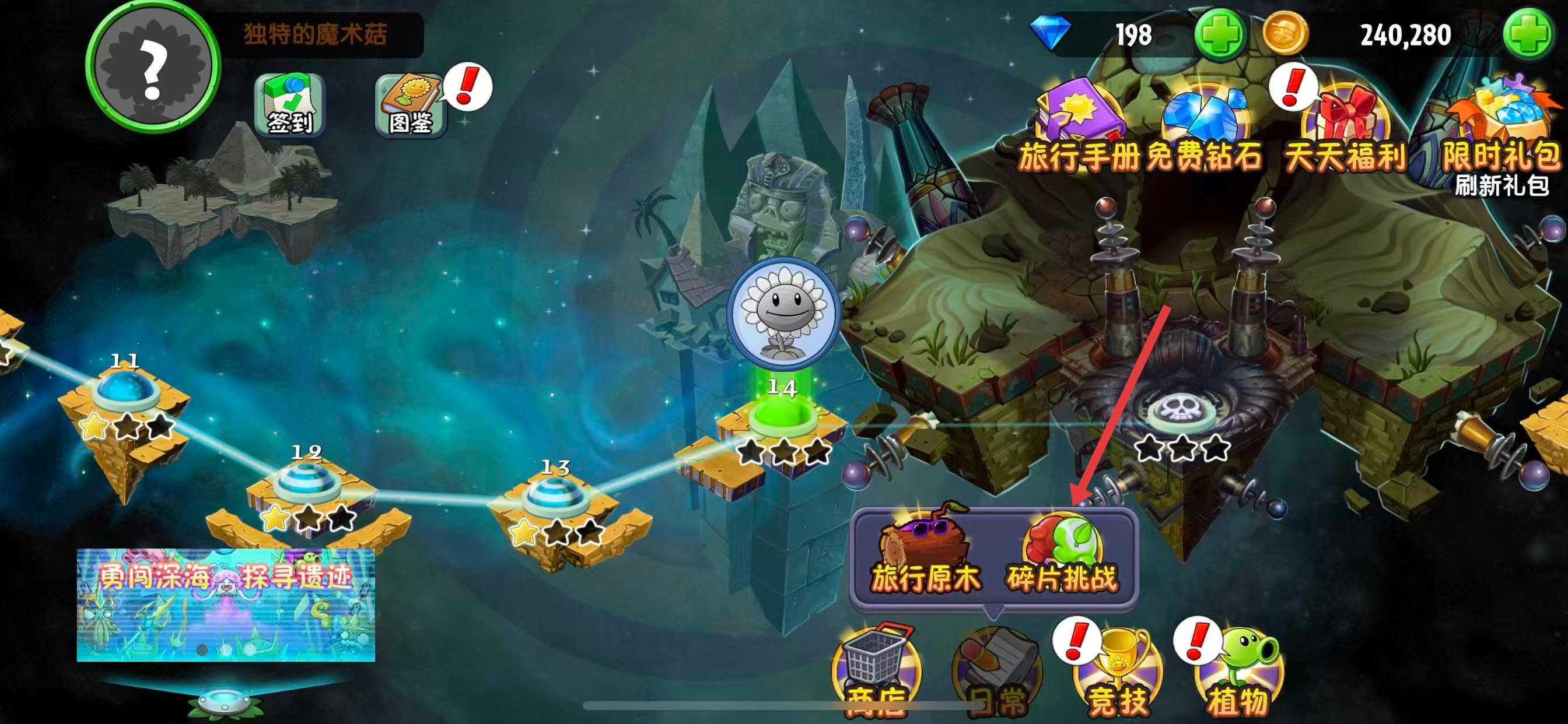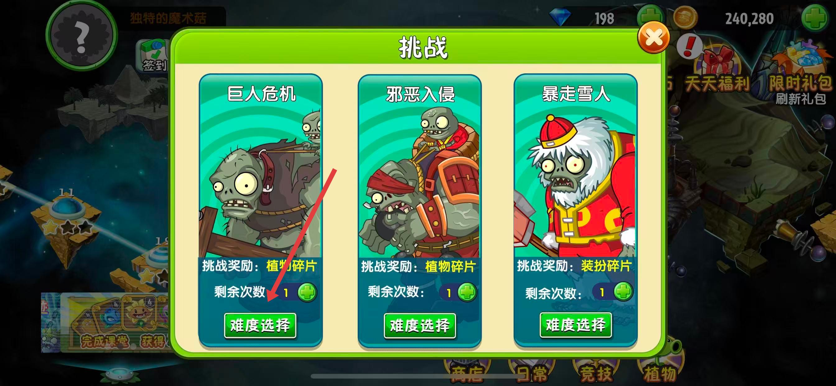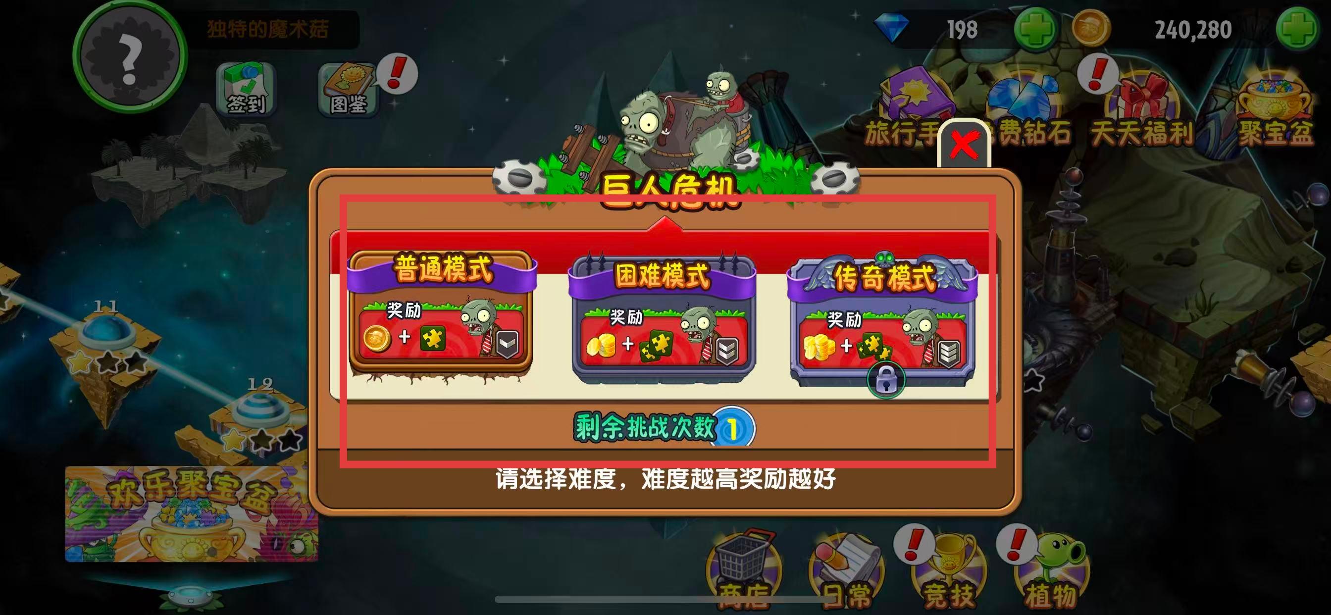 4、,根据自身游戏实力选择普通、困难或传奇模式,成功完成挑战后,会获得对应植物碎片奖励。