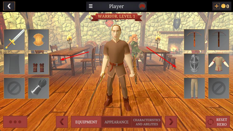 1、可选择剑、弓箭、盔甲等装备为战士搭配,定制角色外观与战斗能力,为对战做好准备。