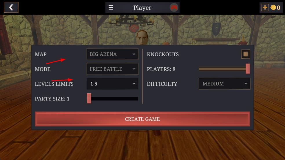 2、在游戏创建界面,选择地图、模式、等级限制等参数,调整玩家数量与难度,点击CREATE GAME开启对战。