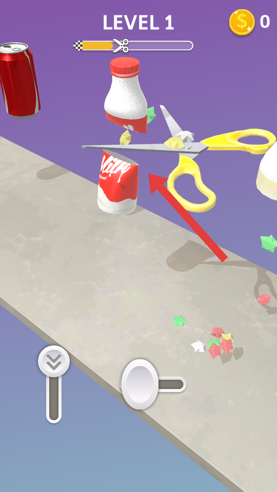 1、操控剪刀移动,对准物品如易拉罐、瓶子进行切割,这是完成关卡的基础操作,对准才能有效切割物品。