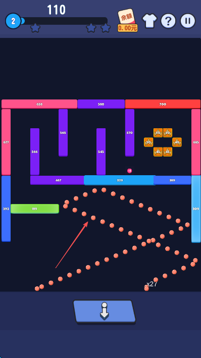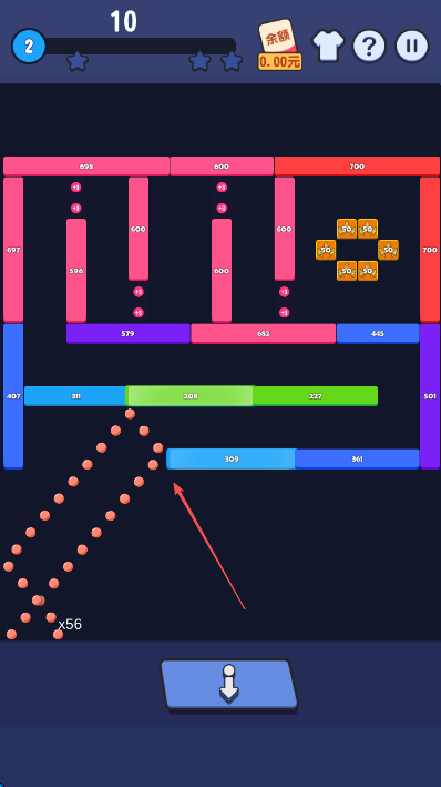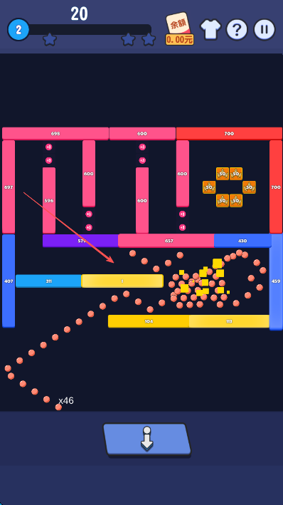 1、观察关卡中方块布局和数字,优先选择能撞击多个方块或数字较大的角度,点击下方蓝色按钮发射弹球,争取一击多效。