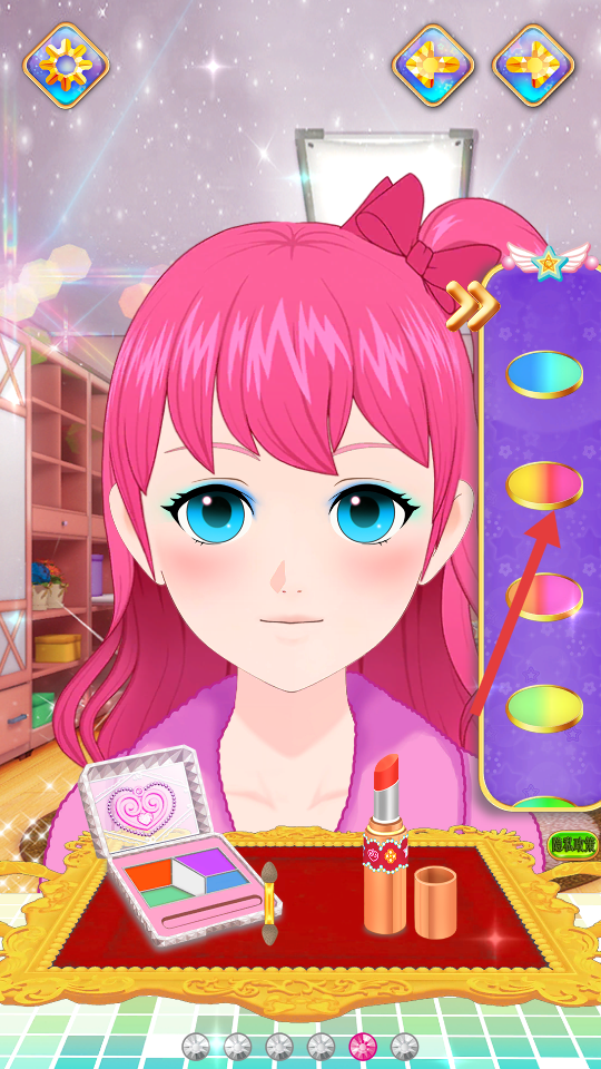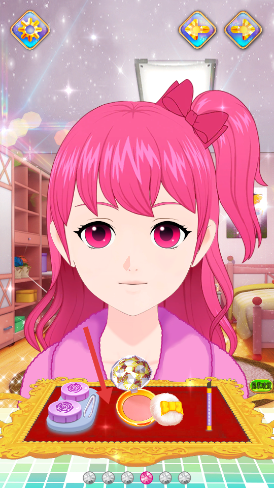 3、化妆互动反馈:每完成一个化妆步骤,公主会给出可爱的语音反馈,同时界面弹出闪光特效与小星星动画,让孩子在操作过程中获得即时鼓励,增强化妆设计的成就感。