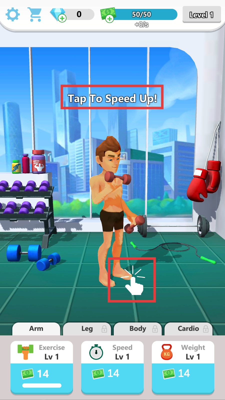 1、看到【Tap-To-Speed-Up!】提示时,点击角色附近区域,加快锻炼速度,提升效率。