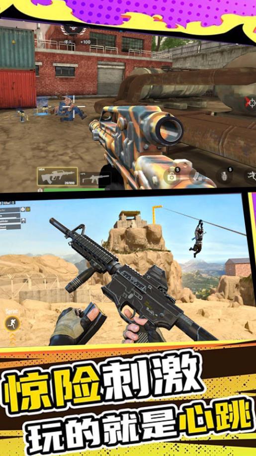 1、数百名玩家一起进入战场,争夺冠军吃鸡者,探索房屋快速获得战斗物资,随时准备战斗。