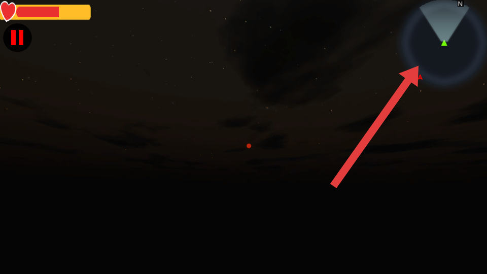1、处于黑暗场景时,留意右上角指引标识,跟随方向提示探索,同时关注左上角生命值,避免危险损耗。