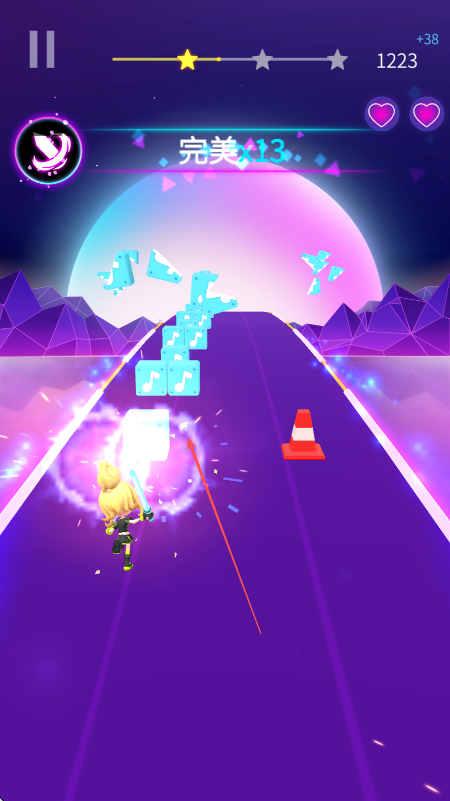 1、进入游戏操控角色沿跑道前进留意右上角爱心生命值避开红色障碍物,观察前方音符方块提前准备攻击。
