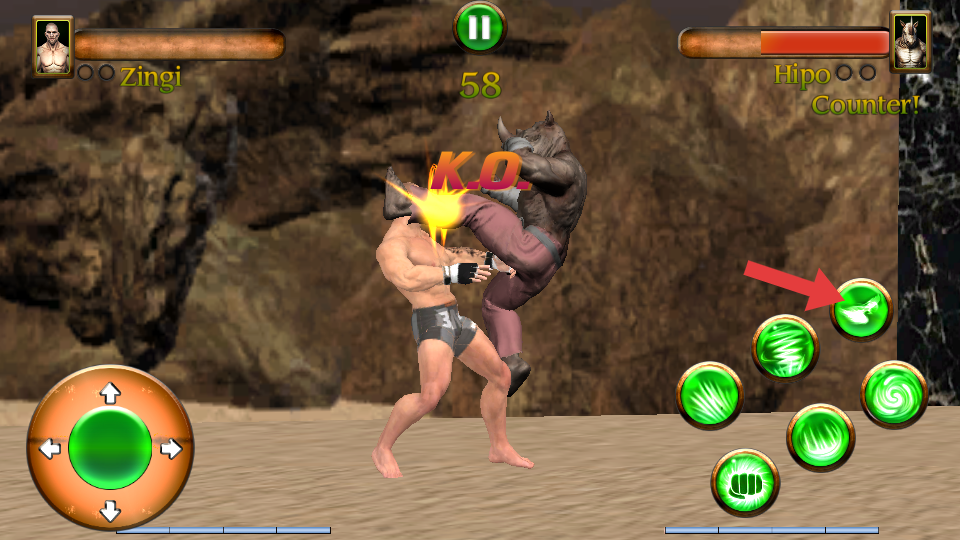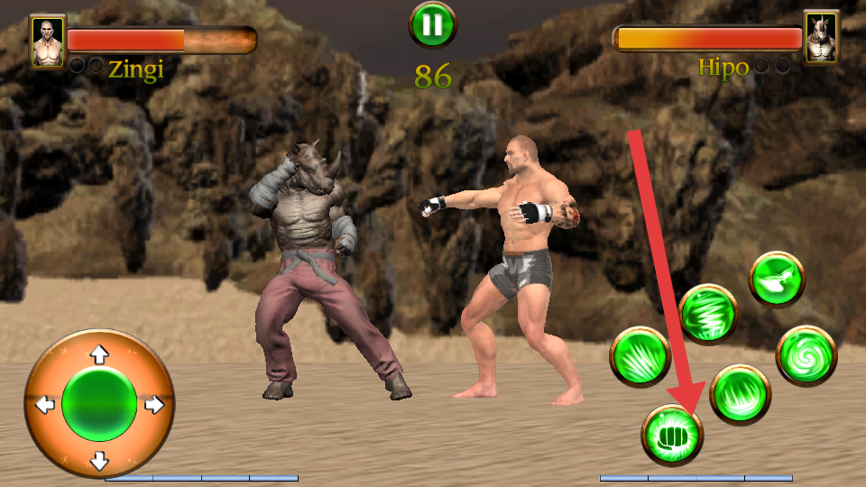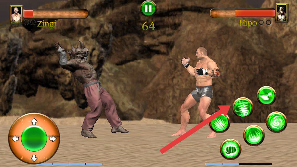 2、用左侧虚拟摇杆控制角色灵活走位,避开怪兽的踢击、挥爪等攻击,点击右侧绿色技能按钮,交替招式消耗血量。