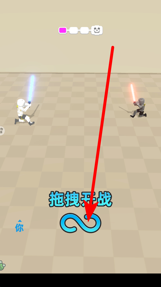 1、开始游戏后,在对决界面,按照拖拽开战的提示进行操作,即可开启与对手的激光剑对决,此时双方角色将在场地中准备战斗。
