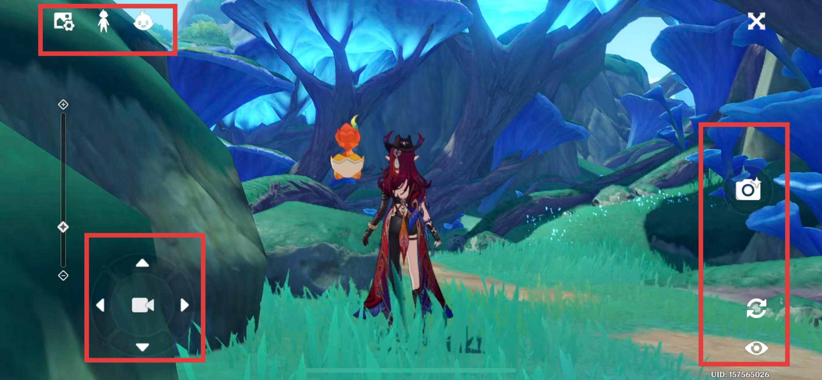 3、左下角是调整拍照角度,右侧从上至下分别是拍照按钮、重置镜头按钮、切换视角按钮,点击左上方的三个小图标,选择不同的拍照滤镜、姿势和特效。