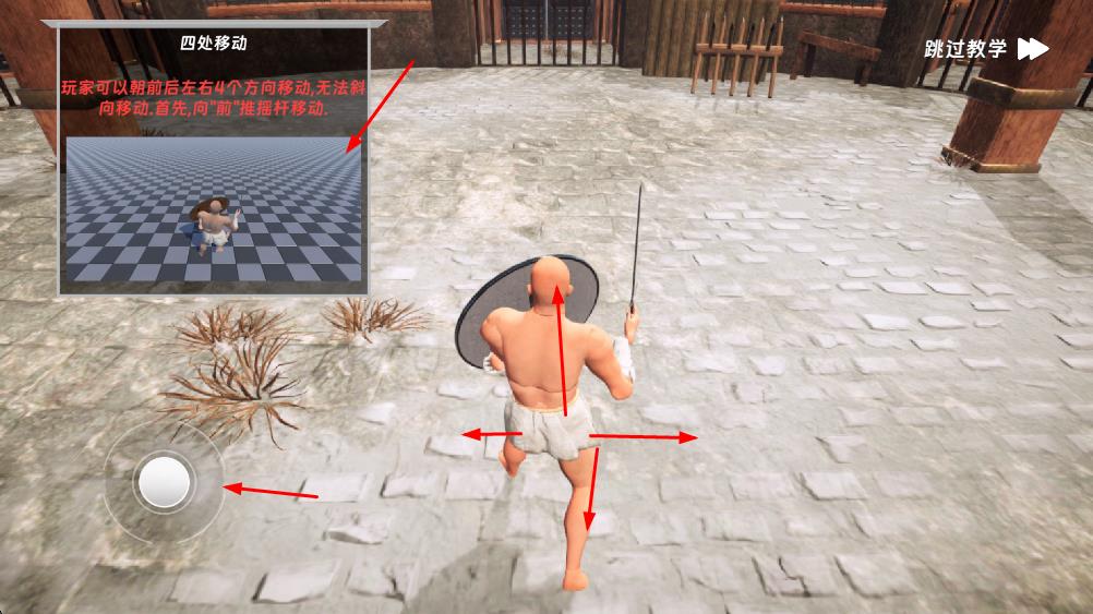 1、通过推摇杆控制角色移动,可朝前后左右4个方向移动,无法斜向移动,灵活调整角色位置,开启格斗之旅。
