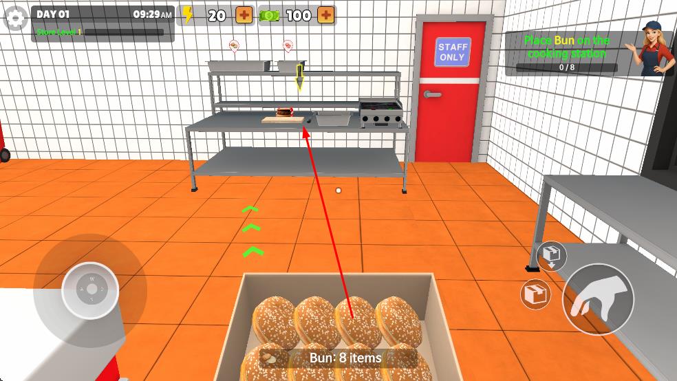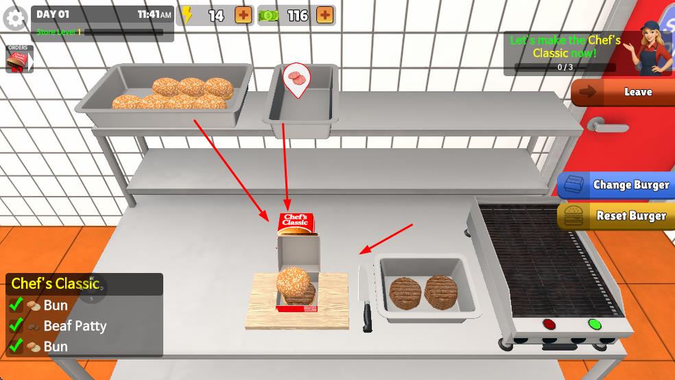 1、在厨房内,根据提示制作指定汉堡,组合面包、牛肉饼等食材,完成汉堡制作任务。