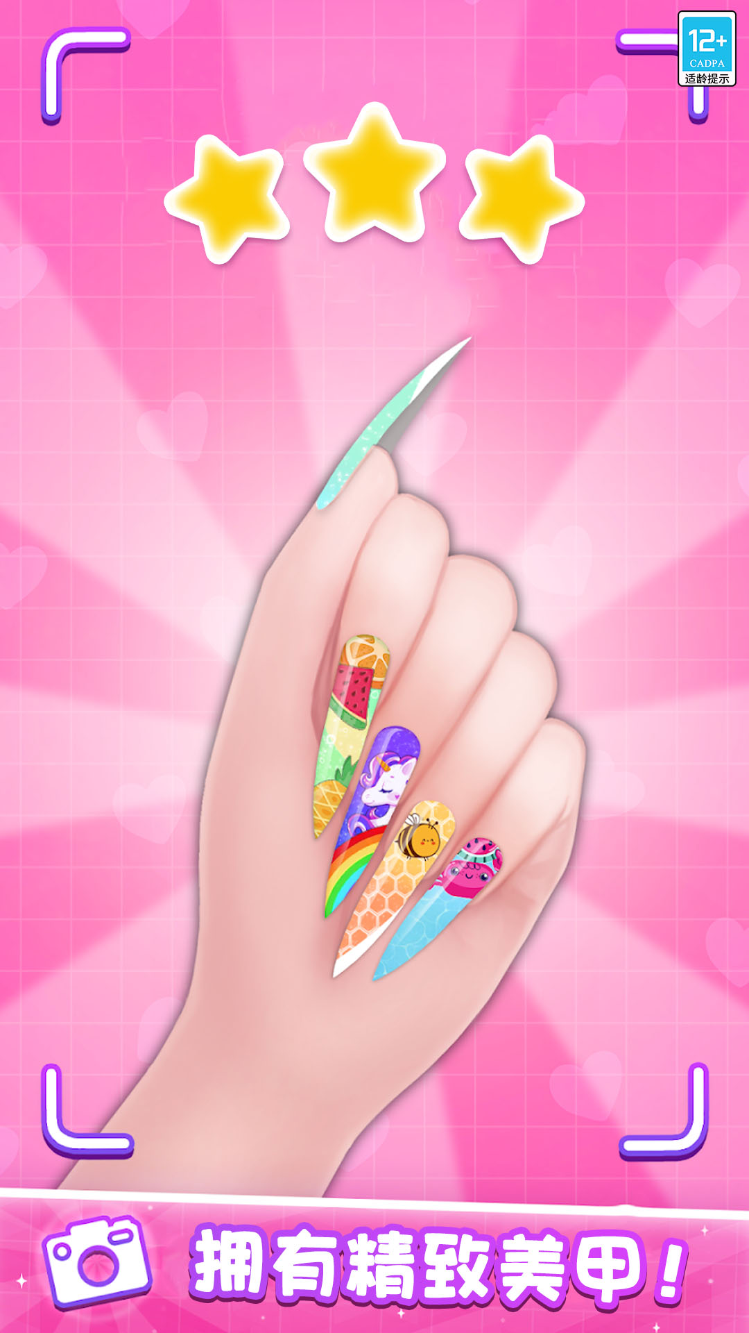 2、真实美甲流程:从修剪抛光到上色装饰完整还原现实美甲工序,细腻模拟真实美甲店的各个环节,带来沉浸式的美甲师职业体验。