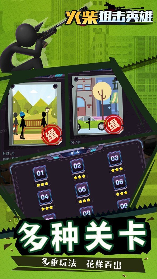 1、火柴人狙击题材创新结合:以火柴人形象为核心,融合狙击枪战玩法,既保留火柴人简约直观的视觉特点,又通过精准狙击、战术布局等设计,打造独特的狙击体验。