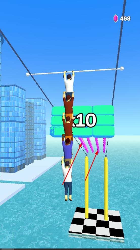 1、进入游戏后,操控角色在城市背景的绳索上左右移动,收集气球等道具,还可与其他角色堆叠,增加整体长度。