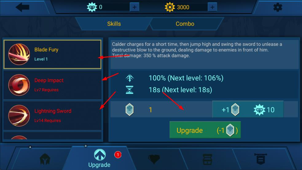 3、战斗后可进入技能界面,升级Blade Fury等技能提升伤害、缩短冷却等,强化战力,为后续战斗做准备。