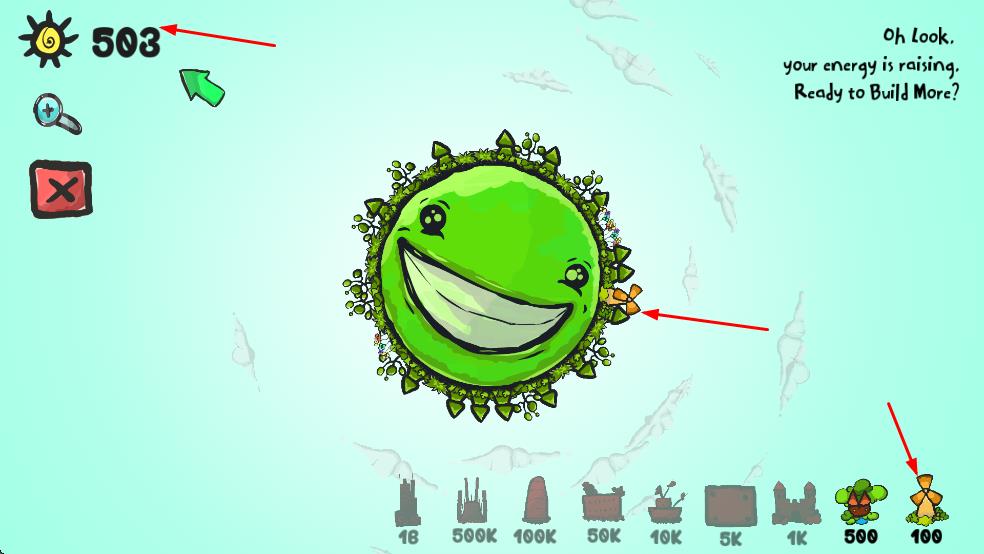 1、进入游戏后关注左上角能量值如初始显示的数值,随着能量提升,准备建造更多建筑,开启星球建设之旅。