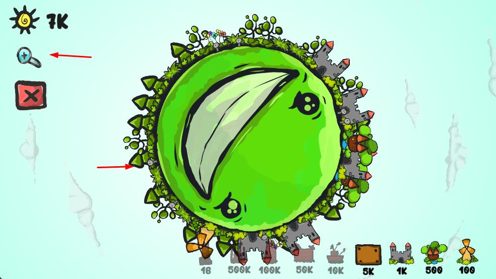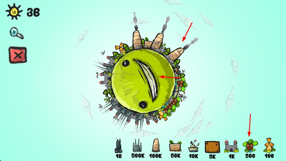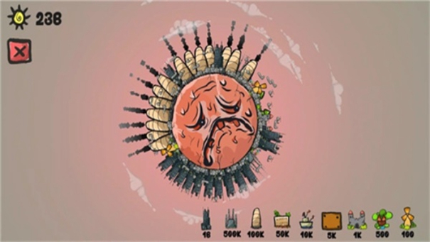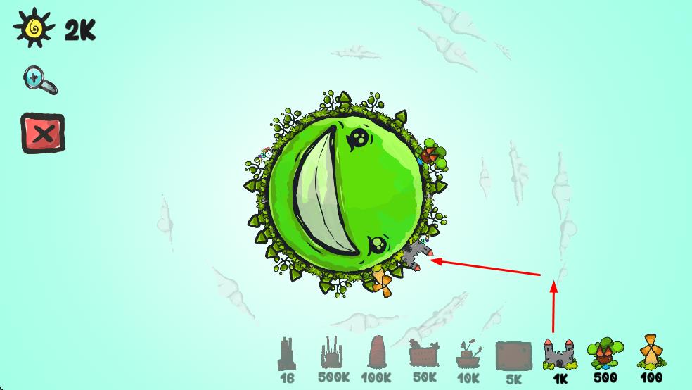 2、在底部选择对应数值要求的建筑如100、500、1K等标识的建筑,将其建造在绿色星球上,丰富星球景观。