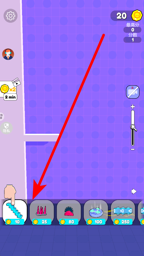 1、进入游戏后,在下方的道具栏中,选择合适的道具,比如楼梯类道具,点击该道具,为后续在场景中放置做好准备,开启寻宝的操作环节。