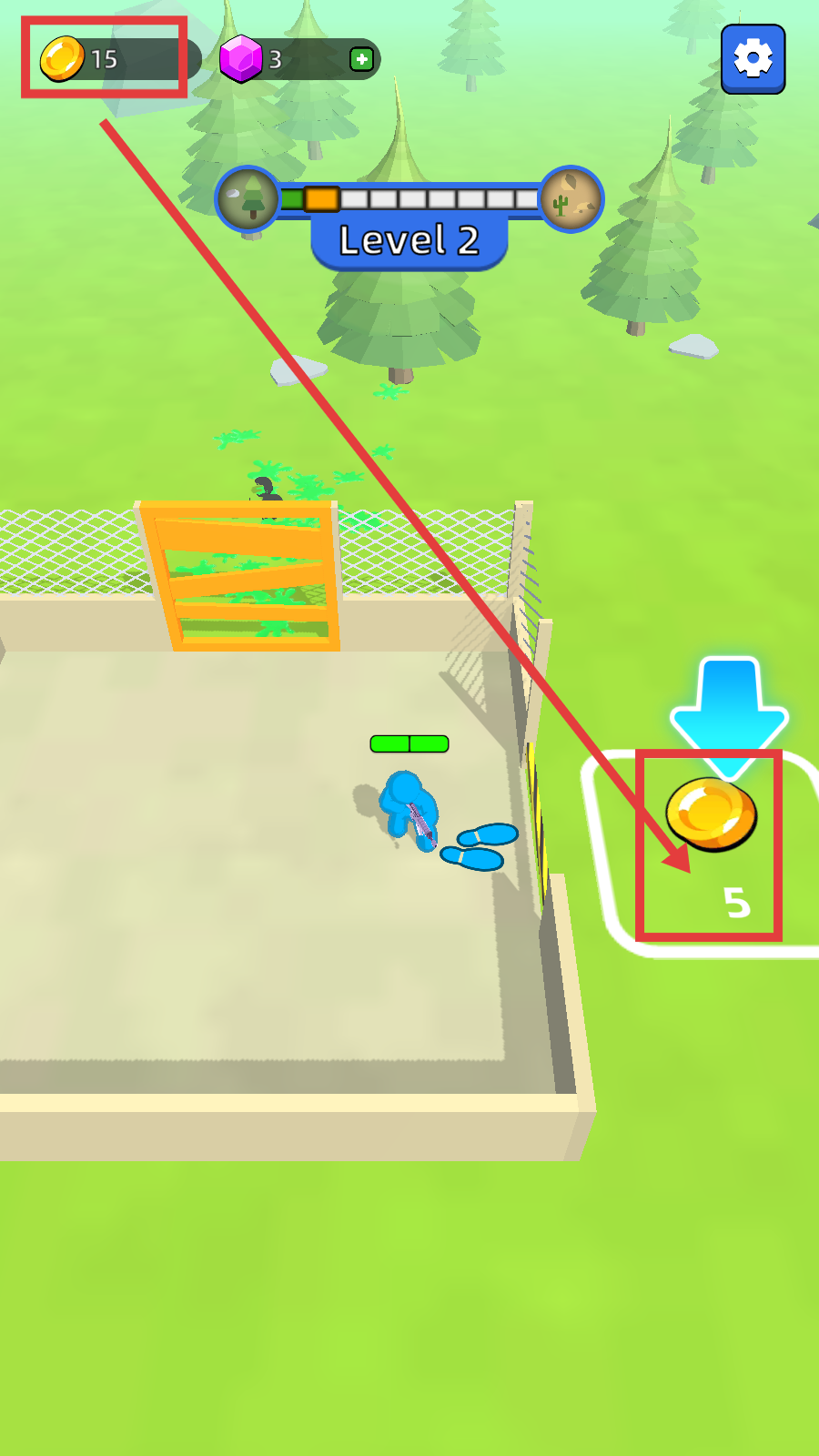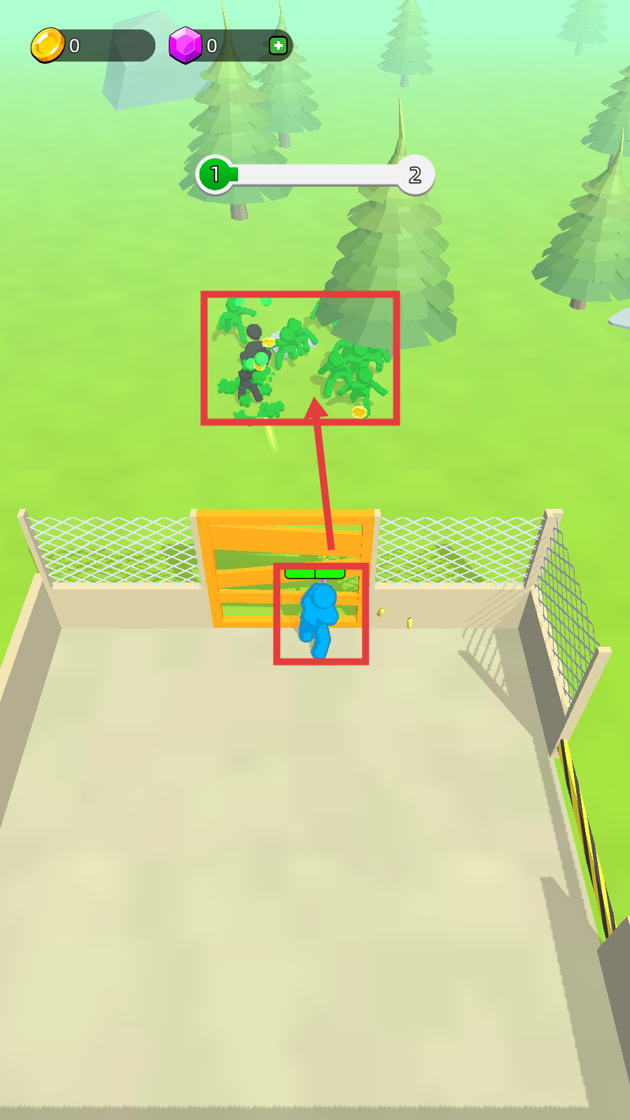 1、操控蓝色角色前往绿色区域,击败【绿色敌人】,同时收集场景中的金币,推进等级进度。